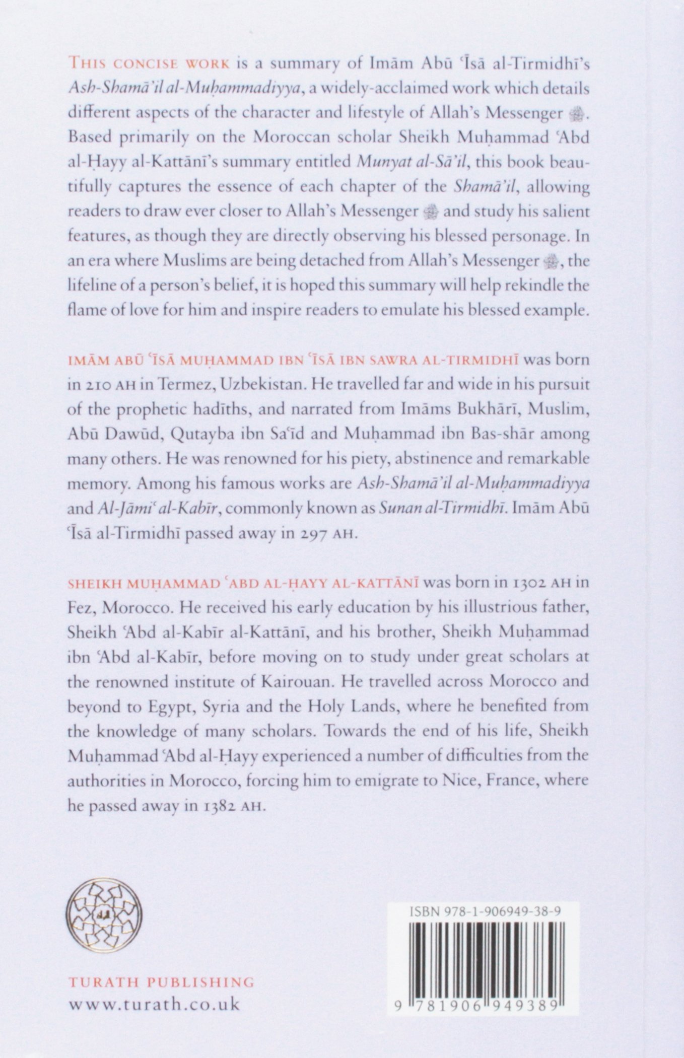 This concise work is a summary of Imam Abu Isa al-Tirmidhi’s Ash-Shamail al-Muhammadiyya, a widely-acclaimed work which details different aspects of the character and lifestyle of Allah’s Messenger (May Allah bless him and grant him peace). Based primarily on the Moroccan scholar Sheikh Muhammad Abd Hayy al-Kattani’s summary entitled Munyat al-Saa’il, this book beautifully captures the essence of each chapter of the Shamail, allowing readers to draw ever closer to Allahs Messenger (May Allah bless him and grant him peace) and study his salient features, as though they are directly observing his blessed personage. In an era where Muslims are being detached from Allahs Messenger (May Allah bless him and grant him peace), the lifeline of a person’s belief, it is hoped this summary will help rekindle the flame of love for him and inspire readers to emulate his blessed example.